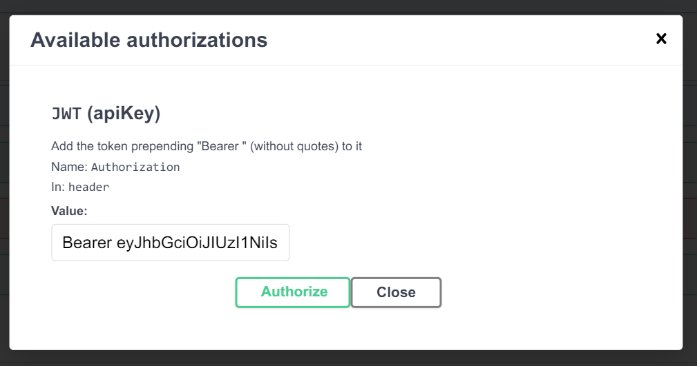 Swagger UI では「Authorize」のダイアログで設定できます。