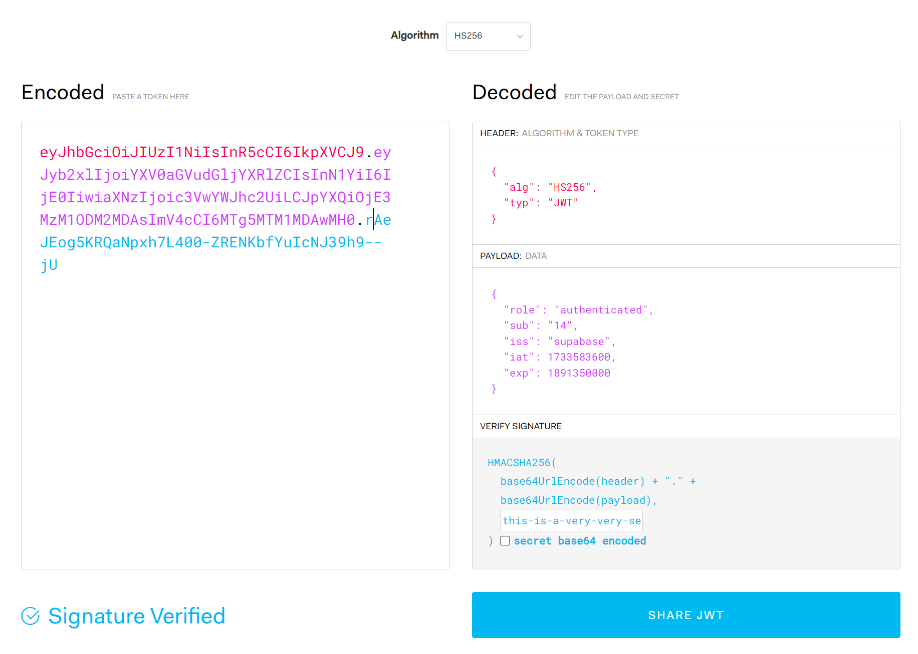 .env から JWT_SECRET を取得し、ペーストします。続いてペイロードを以下のように変更します。